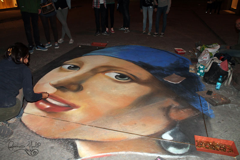 Una delle vie principali di Firenze di sera. la ragazza con l'orecchino di perla di Vermeer copiata da artisti di strada; tecnica: gessetti colorati. Piazza de Ferrari, Genova.